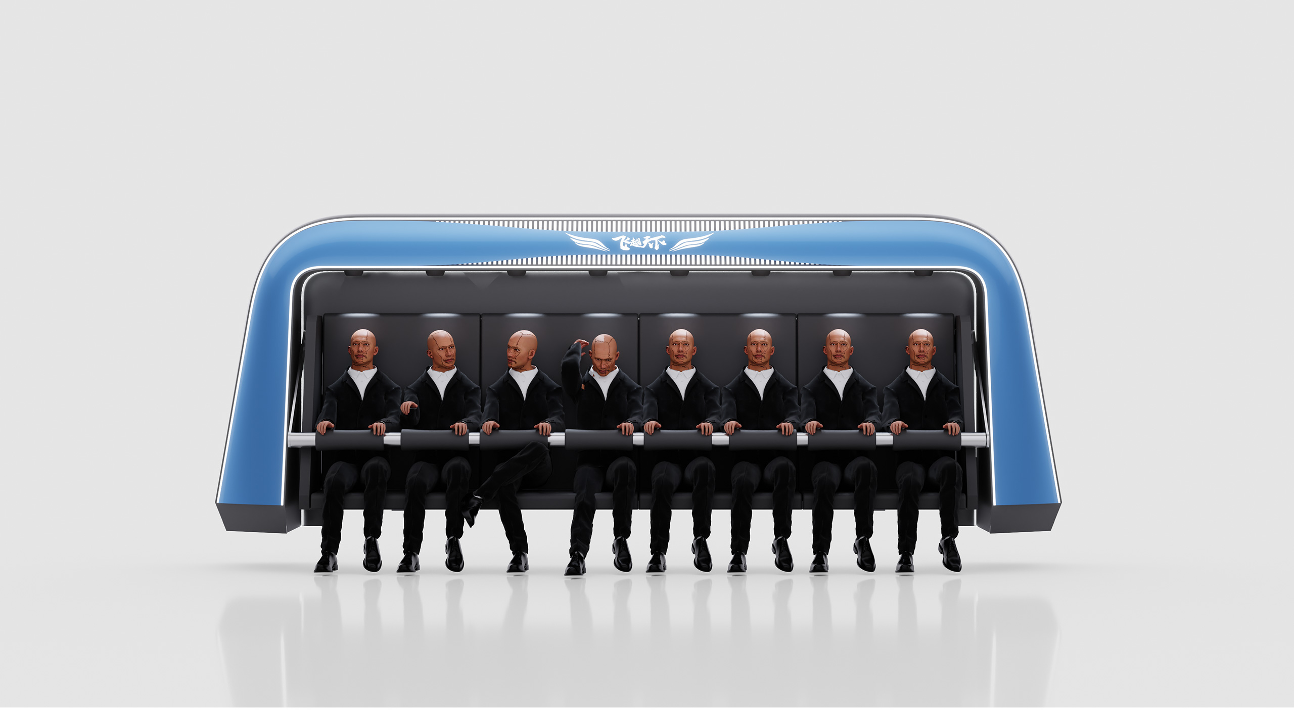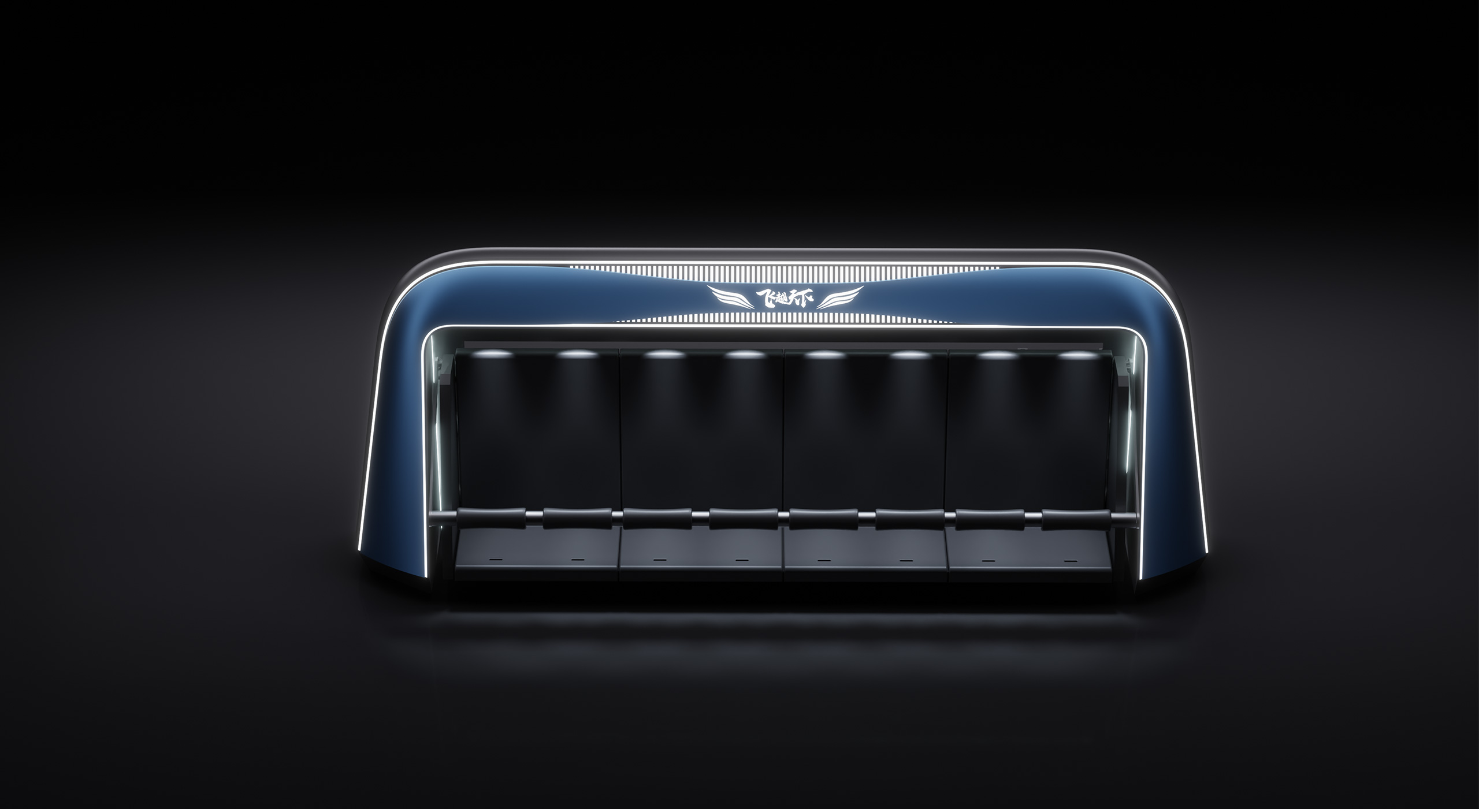 外部边框嵌入LED灯带,通过动态光效增强视觉冲击力,与影院场景完美契合。高辨识度的标识设计:设备正面上方印有品牌LOGO及飞翼图案,象征速度与飞翔感,与飞椅的动态特性相呼应,提升品牌记忆点。沉浸式空间感:椅背区的环绕式设计在视觉上形成一个独立的微空间,为观众带来更好的包裹感和沉浸感。